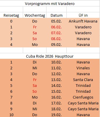 Gruppe I kommt am 08.02.2026 direkt aus Varadero nach Havanna. In Varadero findet vom 05.02. – 08.02. 2026eine kleine Harley Party statt. Für Gruppe II besteht die Möglichkeit über ein Vorprogramm in Varadero mit dabei zu sein. Leider ohne Bikes und auf extra Kosten. Den Preis hierfür (Hotels und Transfer Havanna – Varadero hin/rück) berechnen wir in den nächsten Tagen.